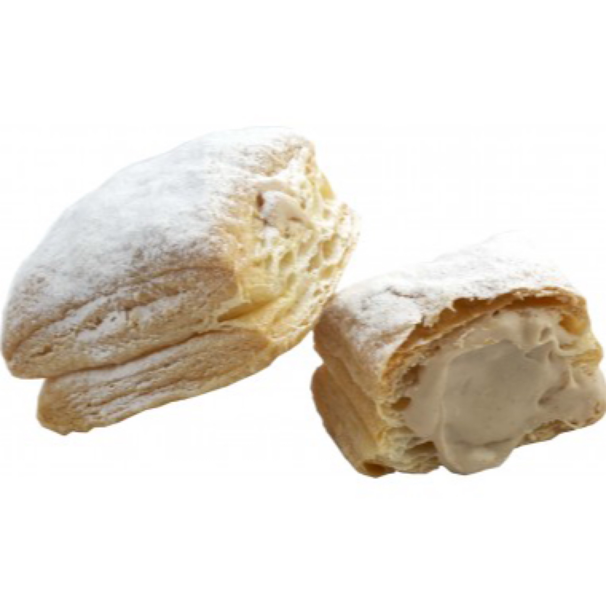 Pasteles de fino hojaldre rellenos con crema de chocolate blanco y cubiertos de azúcar polvo.